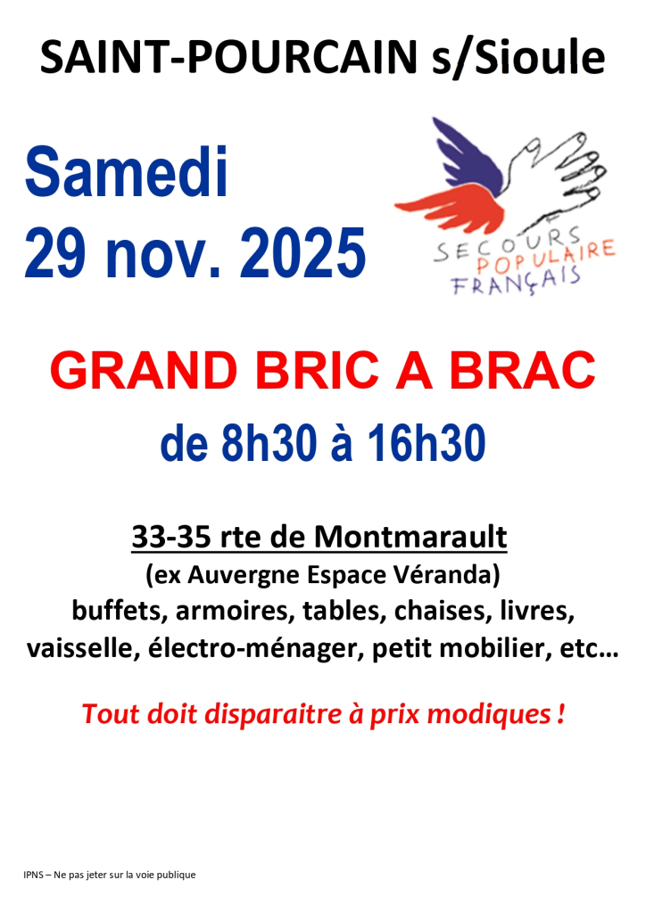 L’antenne de Saint-Pourçain-sur-Sioule du Secours Populaire Français organise un grand bric à brac dans ses locaux route de Montmarault le samedi 29 novembre 2025 de 8h30 à 16h30.