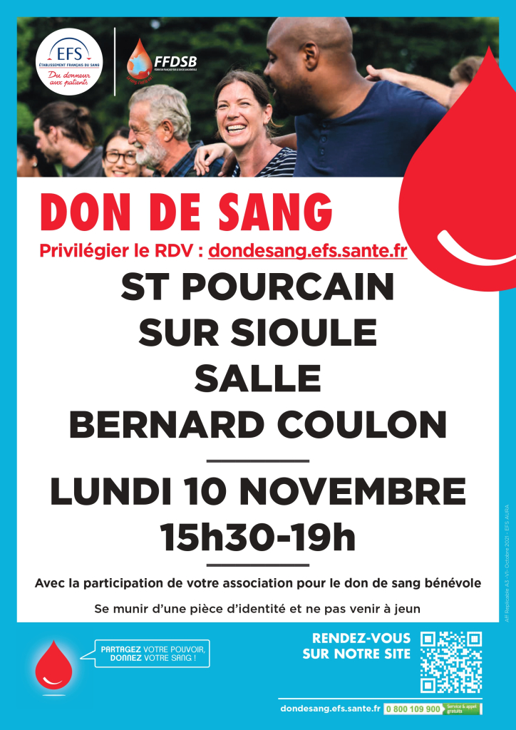 Une collecte de sang aura lieu sur la commune le lundi 10 novembre 2025 de 15h30 à 19h00 à la salle Bernard Coulon.