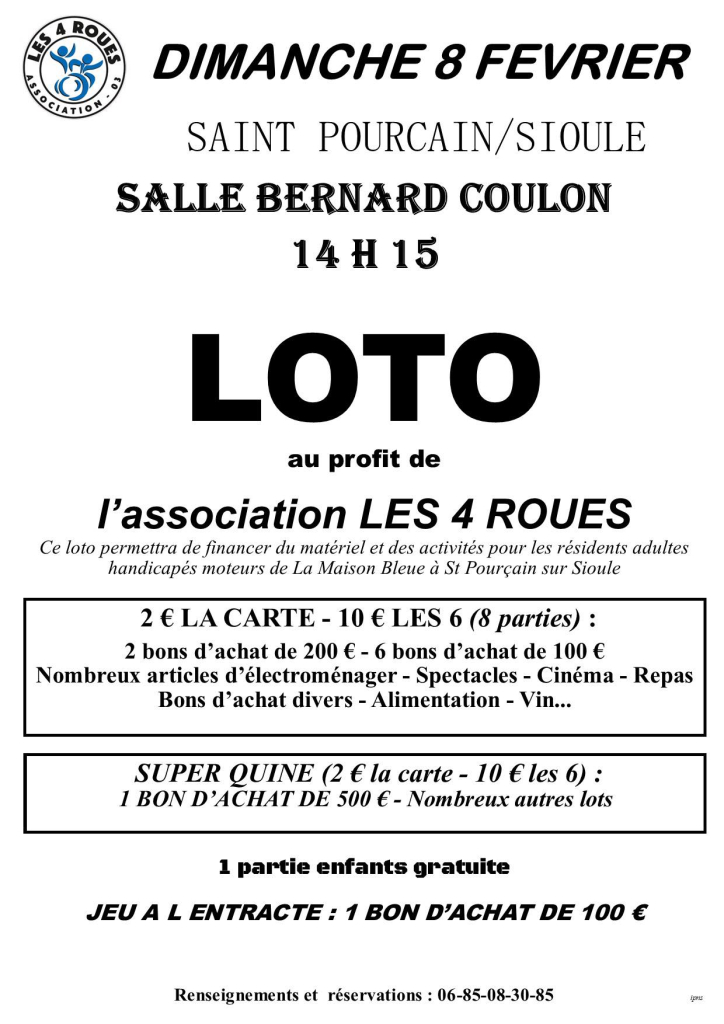 L’association Les 4 Roues organise son loto annuel le dimanche 8 février 2026 à 14h15 à la salle Bernard Coulon.