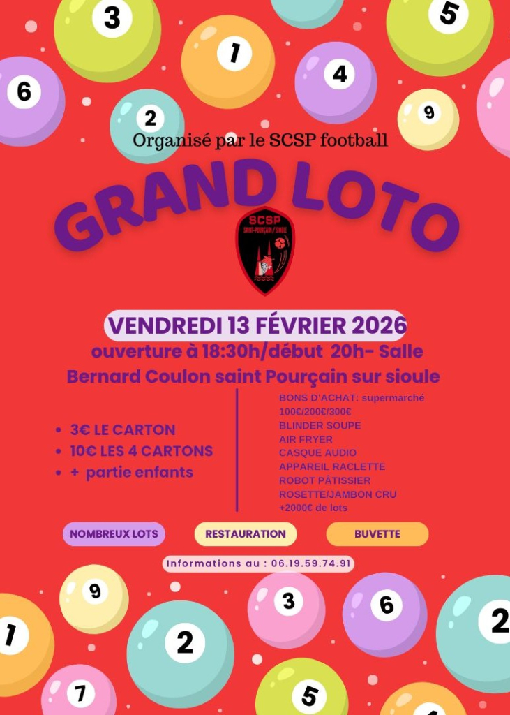 Le Sporting Club Saint-Pourçain Football organise son loto annuel le vendredi 13 février 2026 à la salle Bernard Coulon.