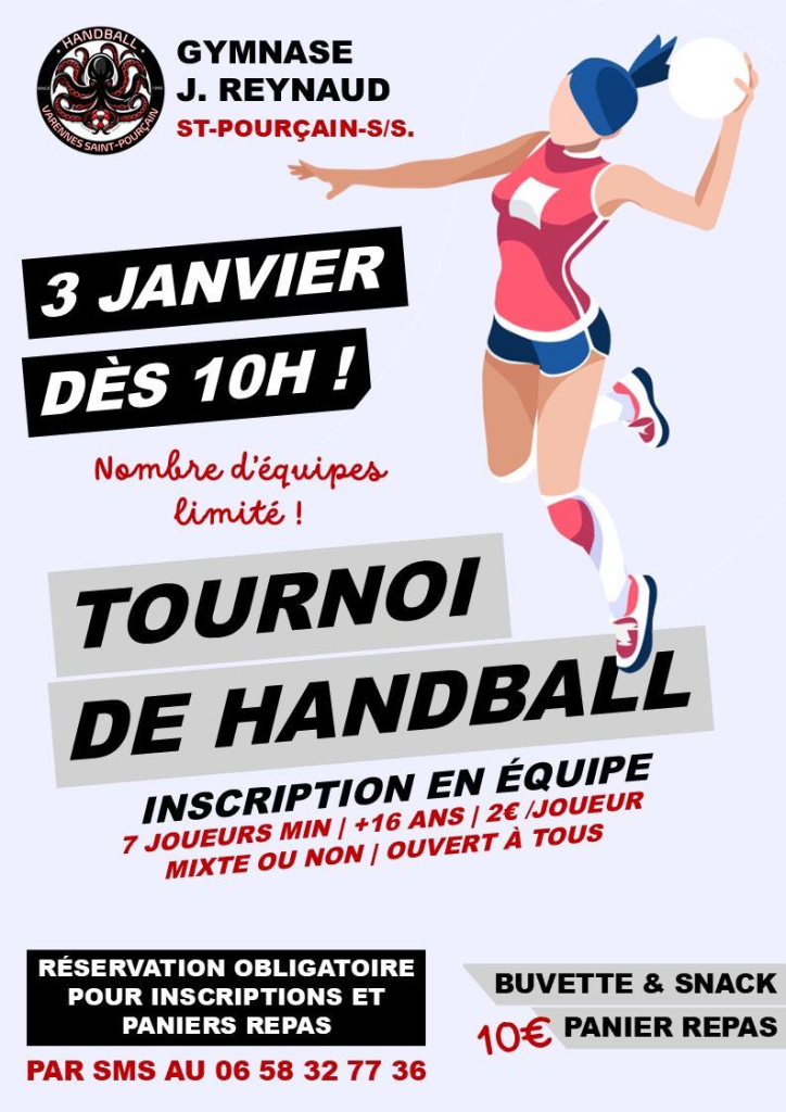 Le club de handball Varennes-Saint-Pourçain organise son tournoi de handball ouvert à tous le samedi 3 janvier 2025 dès 10h00 à la salle Jean Reynaud.