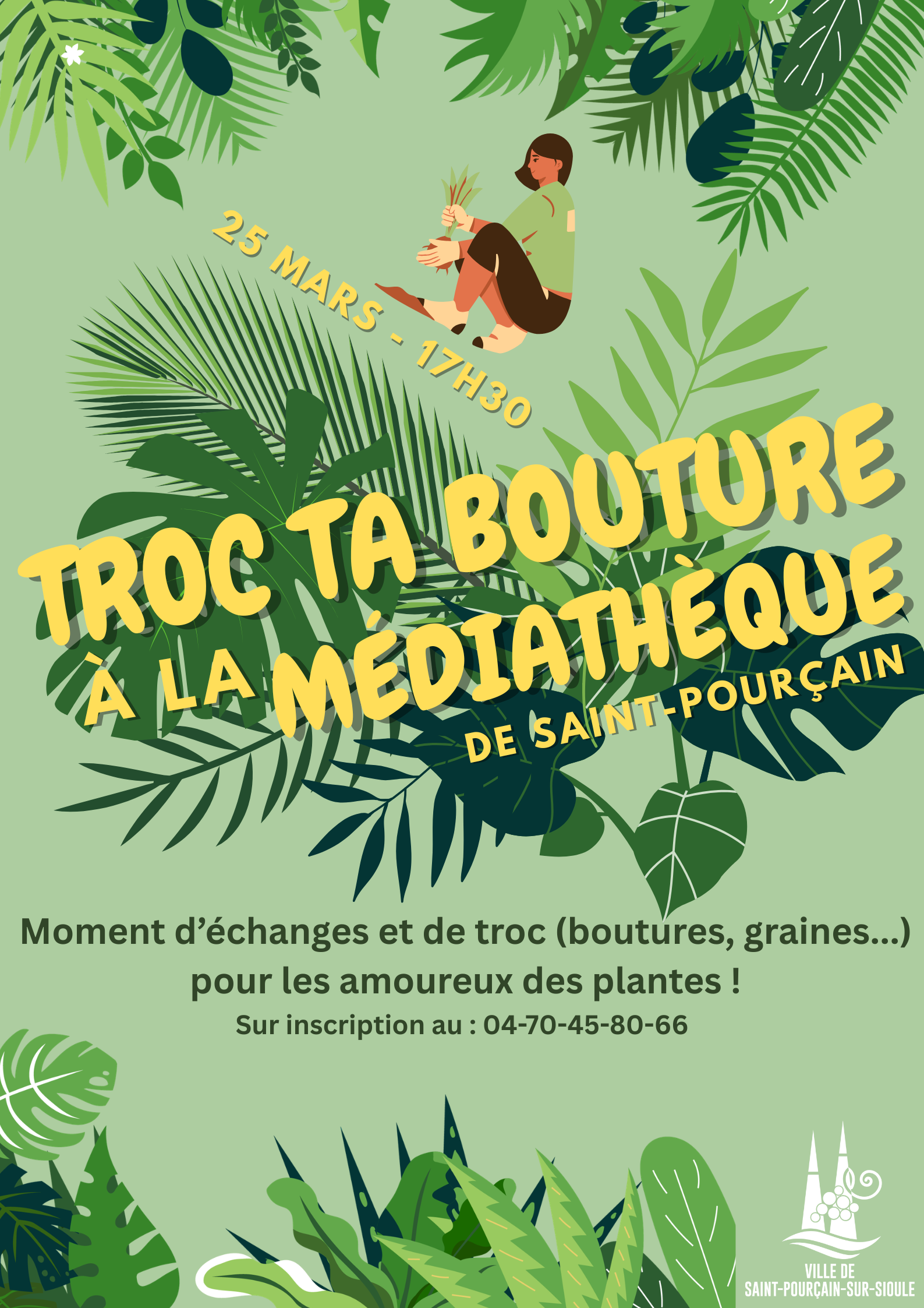 La Médiathèque de Saint-Pourçain organise une opération « troc ta bouture », un moment d’échanges et de troc pour boutures, graines et autres, le mercredi 25 mars 2026 à 17h30 (sur inscription uniquement).