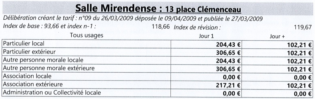 La salle Mirendense comprend 296 chaises et 32 tables. Elle est équipée d’une estrade idéale pour les représentations. Cette salle comprend aussi des toilettes, un écran mural, un escabeau et un espace « cuisine » avec un plan de travail et un frigo. Un porte-manteaux, un pupitre et des rallonges sont à votre disposition. La salle Mirendense est aussi sonorisée.