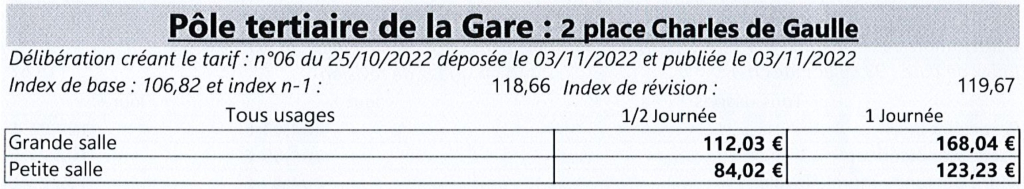 La salle a été construite en 2022. Elle possède une capacité de 70 personnes en configuration debout avec 18 tables et 50 chaises. Elle est équipée d’un vidéoprojecteur et d’une kitchenette au RDC du bâtiment. Un matériel de visioconférence est disponible sur demande.
