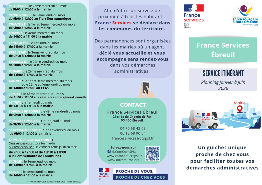 Tous les renseignements sur les permanences sont à retrouver sur le site internet de la Communauté de communes : France Services – Communauté de Communes Saint-Pourçain Sioule Limagne (comcom-ccspsl.fr)