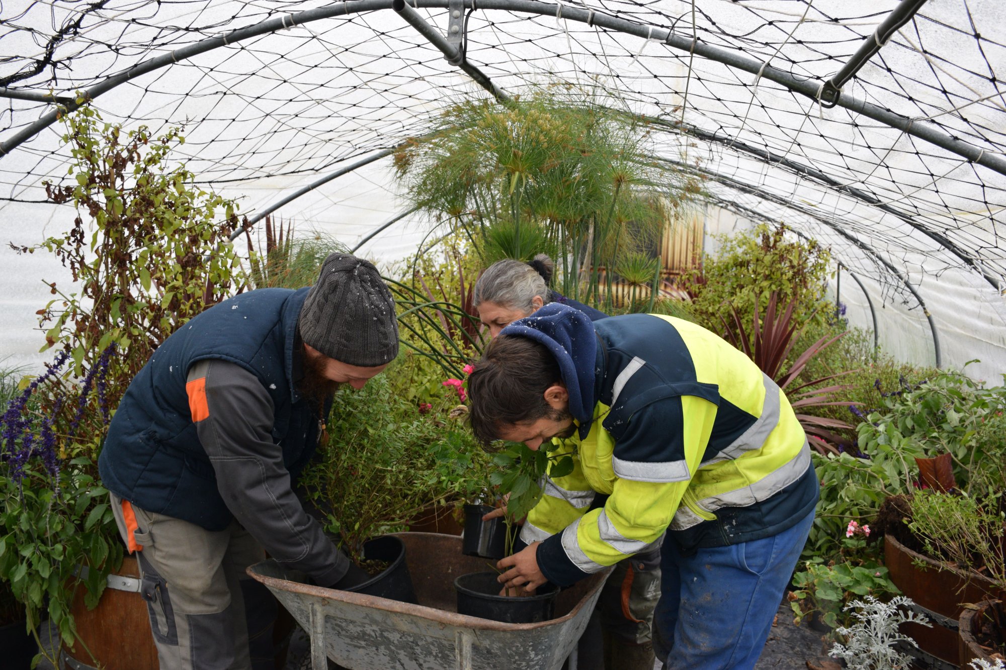 Sébastien (à droite) accompagnée de Jean-Mickaël et Chrsytel du service Espaces verts.