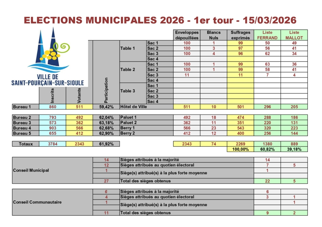 Suite aux élections municipales et communautaires du dimanche 15 mars 2026 à Saint-Pourçain-sur-Sioule, retrouvez sur cette page les résultats officiels des élections à Saint-Pourçain et dans le canton.