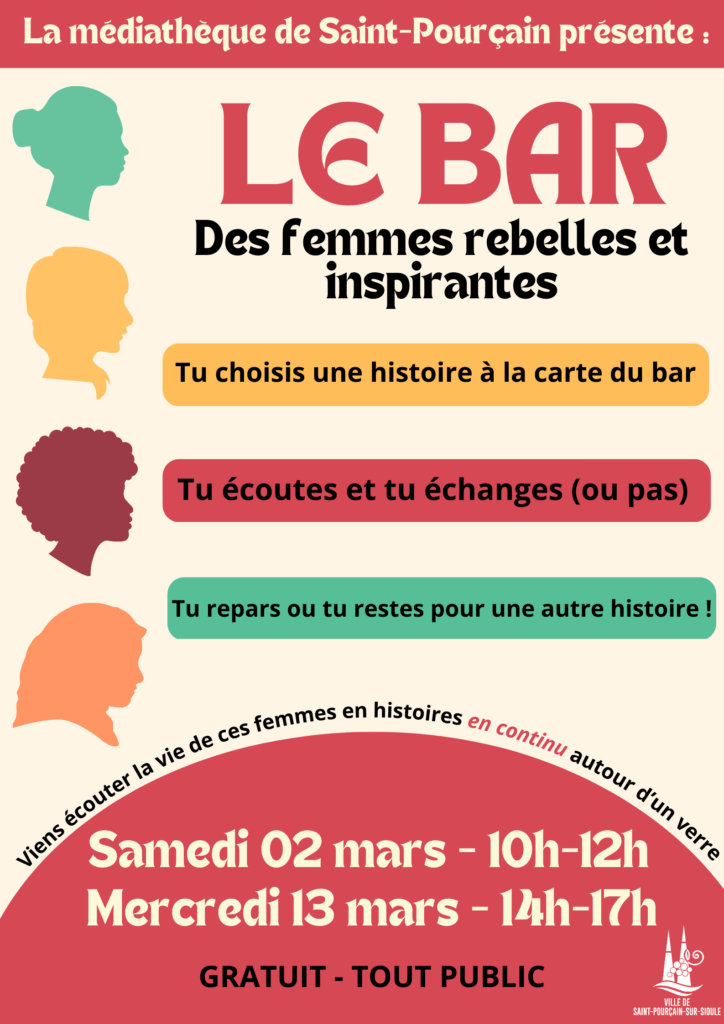 Que vous soyez grand ou petit, profitez de votre passage à la médiathèque le samedi 02 mars (de 10h à 12h en continu) et le mercredi 13 mars (de 14h à 17h en continu) pour en apprendre plus sur de nombreuses femmes inspirantes en écoutant une ou plusieurs histoires. Choisissez votre histoire, écoutez-là, échangez avec Chantal autour d’un verre et repartez (ou restez pour écouter une autre histoire !).