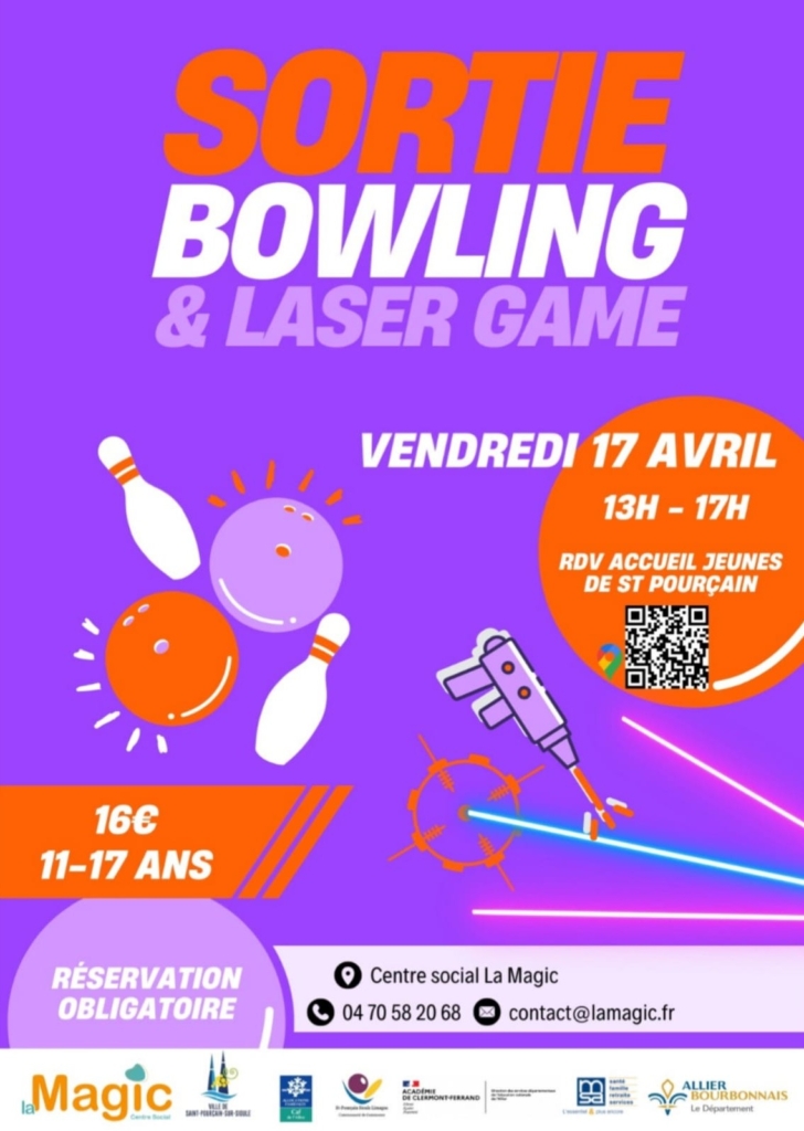 Le Centre Social La Magic organise une sortie bowling et laser game le vendredi 17 avril 2026 de 13h00 à 17h00, avec comme lieu de rendez-vous l’Accueil Jeunes de Saint-Pourçain (Maison des associations Louis Dumas).