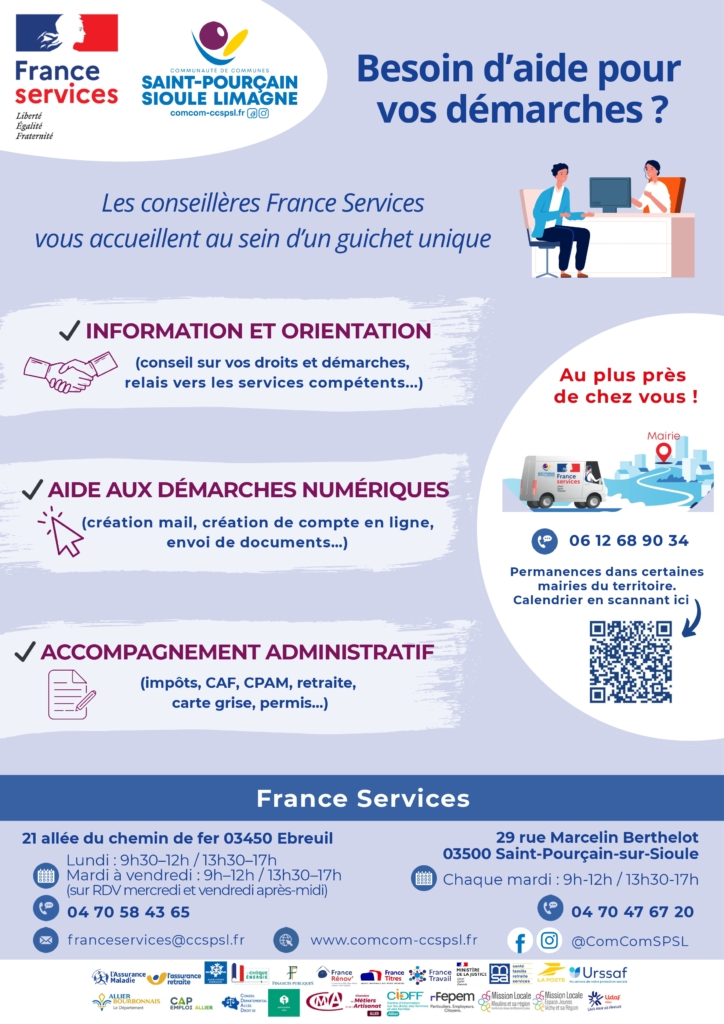 Tous les renseignements sur les permanences sont à retrouver sur le site internet de la Communauté de communes : France Services – Communauté de Communes Saint-Pourçain Sioule Limagne (comcom-ccspsl.fr)